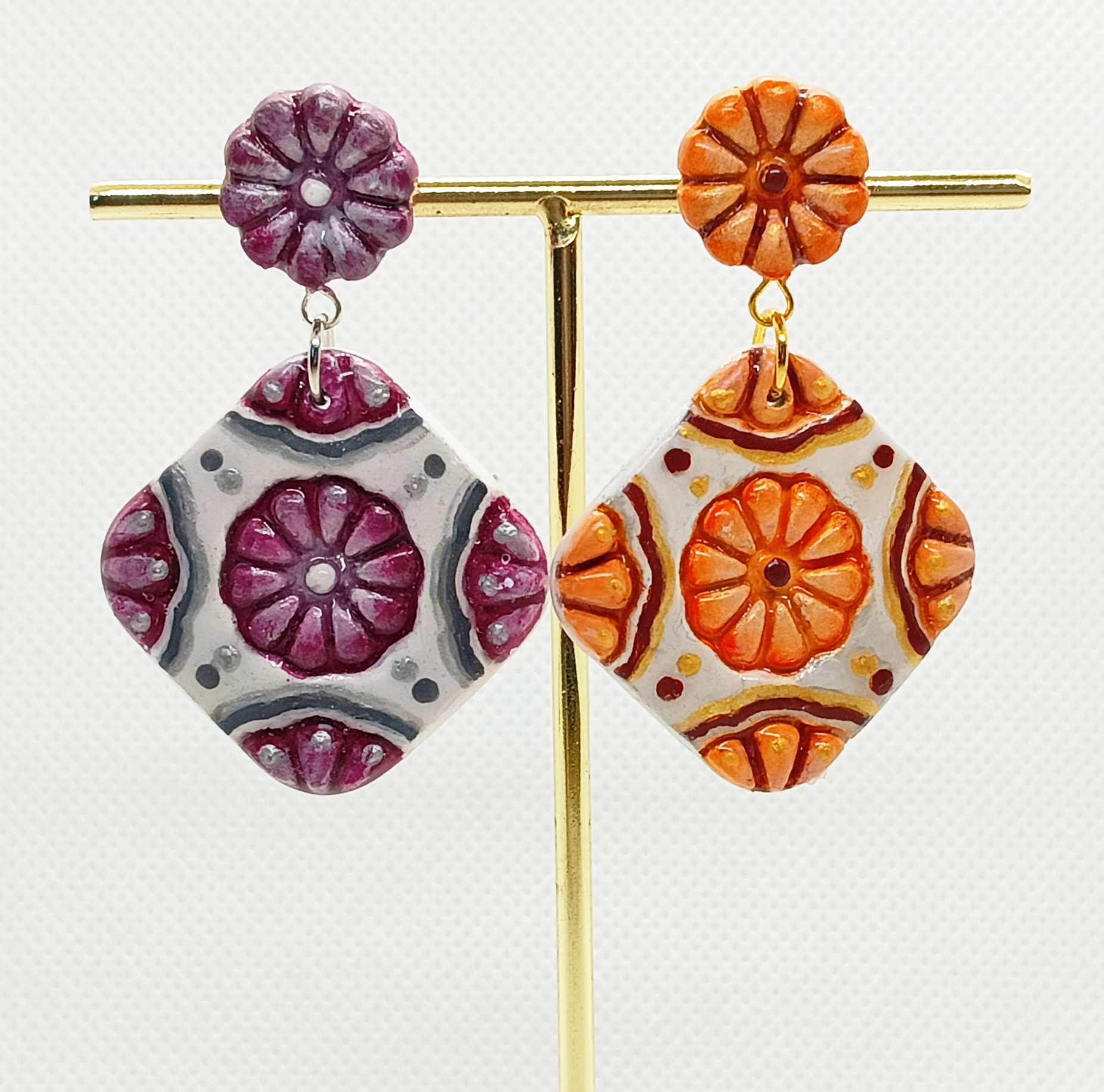 Orecchini artigianali realizzati in porcellana fredda e interamente dipinti a mano, ispirati alla maiolica artistica, con motivo floreale in rilievo e forma a rombo con fiore superiore, eleganti e originali.