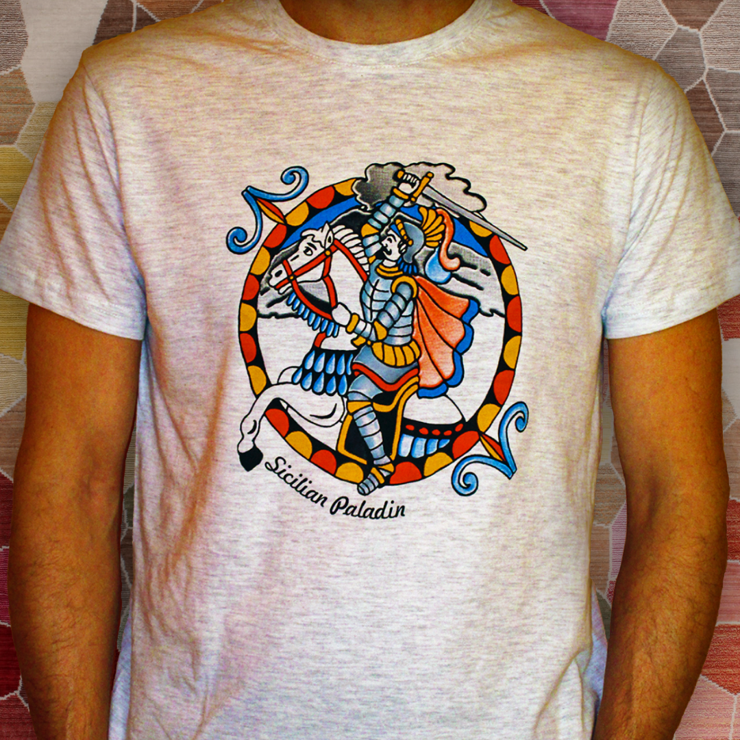 Ispirata all’epica dell’Opera dei Pupi, questa maglietta raffigura il Paladino siciliano, simbolo di coraggio e identità dell’isola.